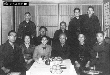 旧山本質店の面々、前列右から三番目が主人の山本周五郎、その左が娘の敬子さん。その後ろのメガネが当時38歳の清水三十六(サトム)※当時は質屋の番頭で後の新進作家 ペンネーム山本周五郎です
